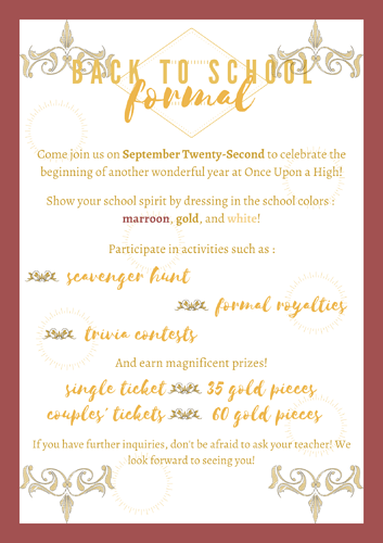 She took out the stack of papers she had been given earlier-they were posters for the upcoming back to school formal. She did not feel like talking about them-the students would get all riled up. They were already acting a bit too bratty for her taste-one crying, several late, plenty not even trying with the uniform. She felt they did not deserve this. Though last year’s dance had gone smoothly, the students had left the floor a mess-littered with cups, napkins, food, and plates. But…she really had no choice. “In a few weeks, we will be throwing our annual back-to-school formal. It starts at seven P.M. and ends at midnight.” Using her telepathy to guide a poster into each student’s hands, she continued to speak. “Tickets are thirty-five gold pieces each. If you go as a couple with another student, tickets are sixty gold pieces together. You are to wear white, maroon, or gold to showcase your support for our school.” She didn’t mention this was optional-the dance floor would look best with three main colors. She looked right at the two students she had just argued with. “If you get too many detentions, you might not be allowed to go.” After all of the posters were passed out, she cleared her throat. “I do not want to talk too much about this, we are wasting time. But does anyone have any questions?”