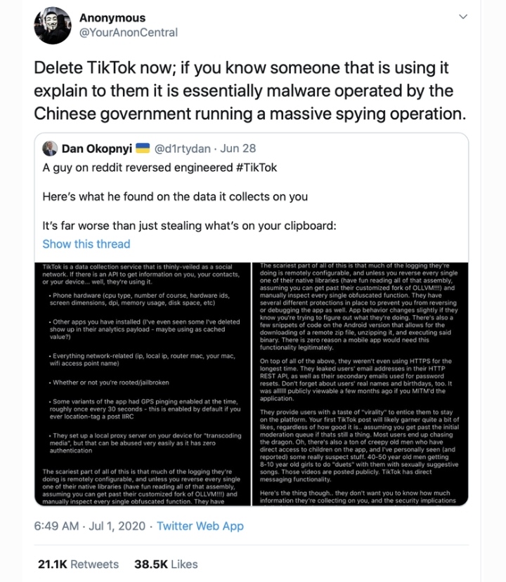To be honest, I donāt care for tik-tok but I will watch the videos my friends send me since they are hilarious. Trump is trying to get tik-tok banned in the USA. Itās bit ridiculous for the reasons they have chosen.